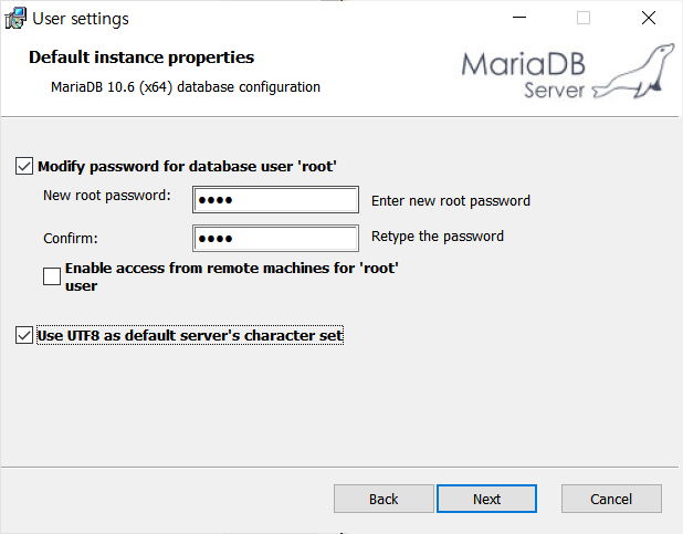 'Enable access from remote machines for 'root' user' 에서는 외부에서 root를 접근하는 것인데 체크하지 않음.