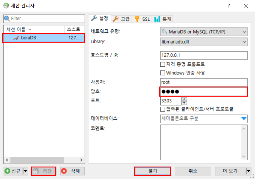 암호는 download했을 때, 정한 비번을 작성하시고 port도 알맞게 입력하고 '열기'