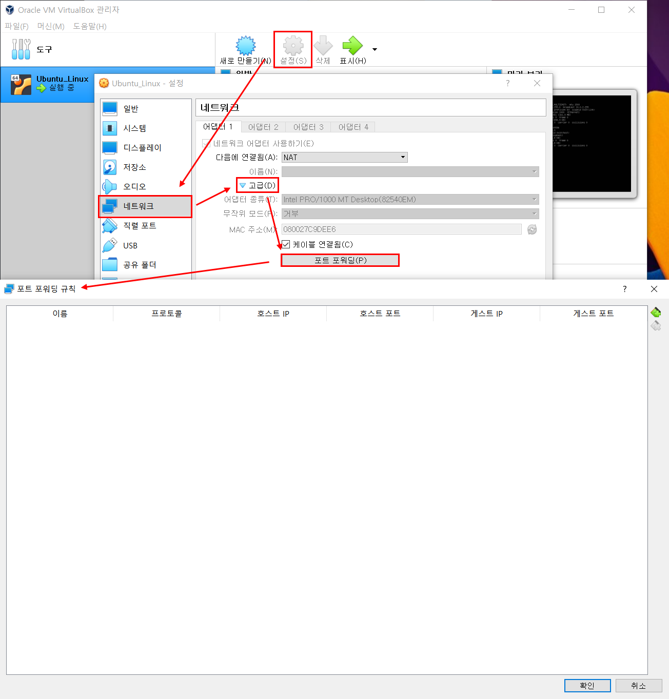 3. Port Fowarding (Ubuntu virtual Box에서 설정)